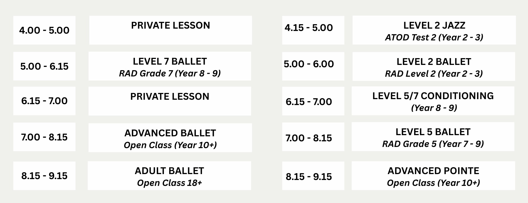 NOTE: Classes do not run on public holidays. If you miss a class, no make up classes and no refunds are provided.