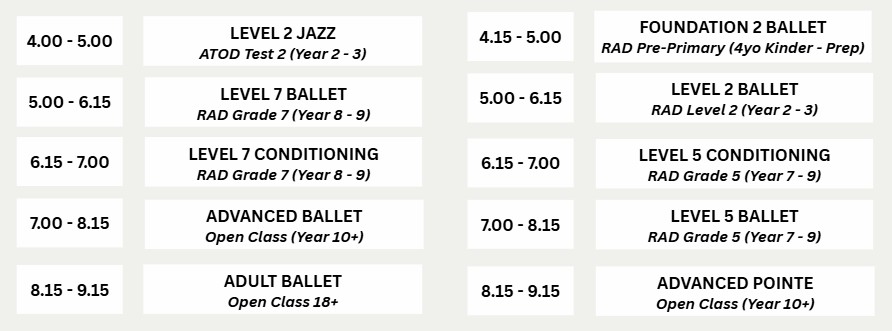 Prices vary per duration of the class and GST inclusive, 45 minutes $215 (pre-school classes), 60 minutes $225, 75 minutes $235, 90 minutes $250